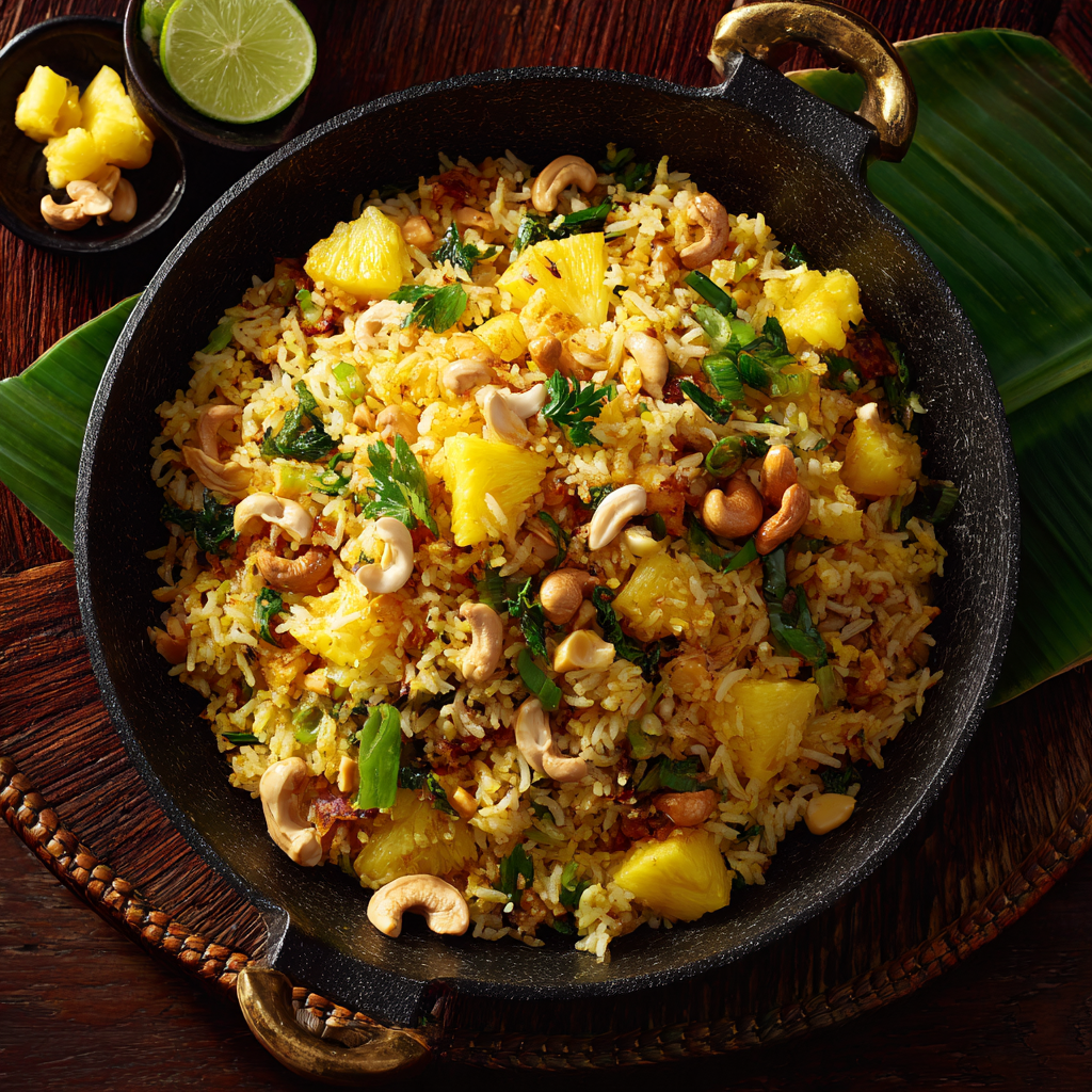 A tropical twist on fried rice, this rice recipe blends jasmine rice with pineapple chunks, cashews, and curry powder. It’s sweet, savory, and colorful—often served in a hollowed-out pineapple.